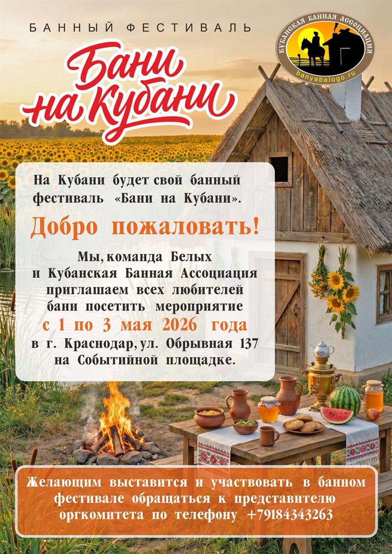 Уважаемые друзья, партнеры, коллеги, любители бани, сообщаем вам о проведении с 1 по 3 мая 2026 г в г. Краснодар Большого Всероссийского Банного Фестиваля «Бани России». Участвовать в фестивали будут различные представители банного и сопутствующего бизнеса, мастера банного дела, технологи и производители оборудования. Все желающие могут принять участие в работе фестиваля.