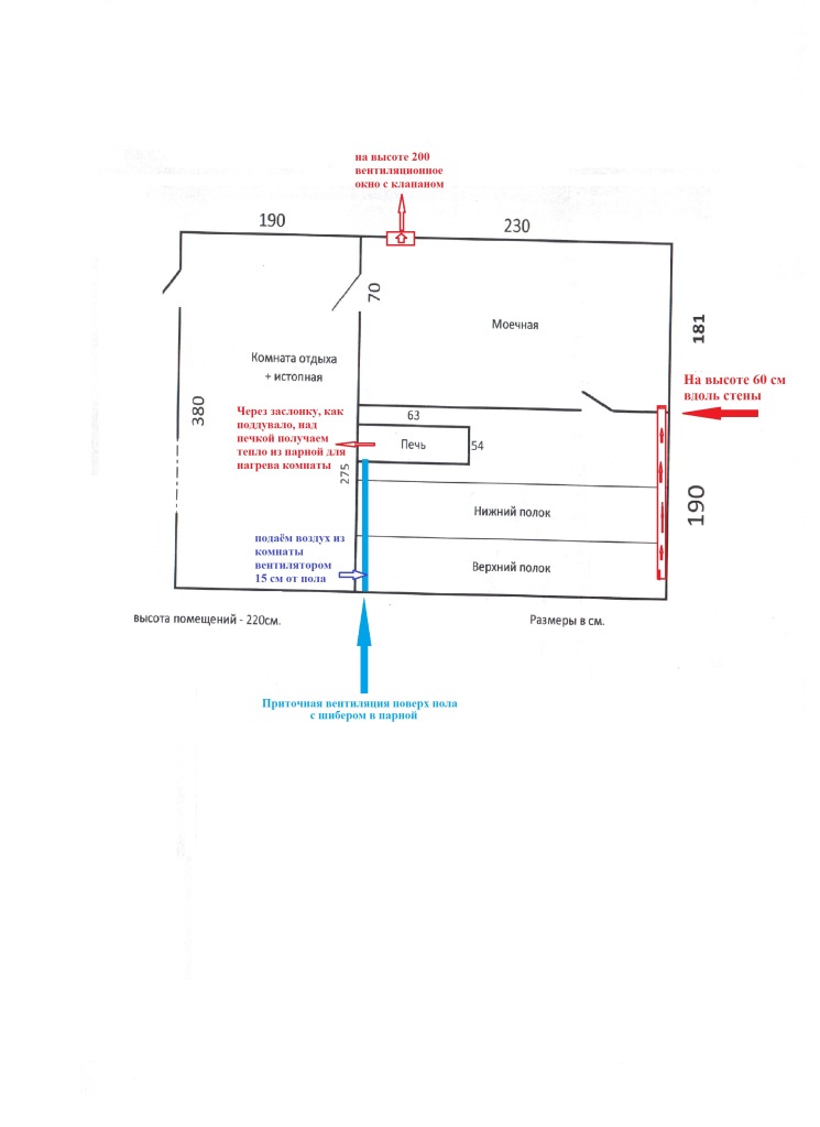 Здравствуйте. Видео посмотрел, очень познавательно, спасибо. Купил уже построенную баню и столкнулся с отсутствием вентиляции. Подскажите пожалуйста: правильно ли я планирую вентиляцию в бане? Добавлю, что прогрев комнаты отдыха (заслонка над печкой и вентилятор) планирую использовать только в начале, при протопке бани. ПОдскажите ещё пожалуйста какого диаметра нужно делать приточную к печи в парной, вытяжную между моечной и парной, и вытяжую с моечной на улицу. Ума не приложу как же сделать приток воздуха к поддувалу печи в комнате, ибо живу в Магадане и боюсь получить с этим поддувом ветер в комнату отдыха...