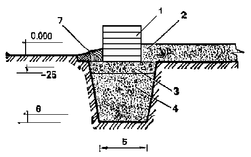 1—цоколь; 2—подсыпка; 3—слой щебня, гравия или кирпичного боя толщиной 20 см с проливкой раствором; 4 — песчаный фундамент; 5—ширина фундамента; 6—уровень заложения; 7 — глиняный замок.